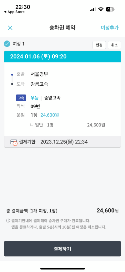 | 예매 후 출발 1시간 이내 취소 | 요금의 10% |