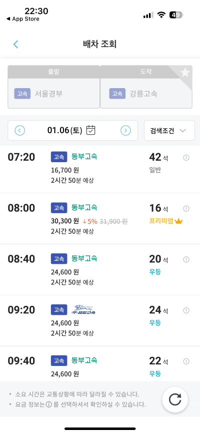 출발시간 확인 후 원하는 버스를 선택합니다