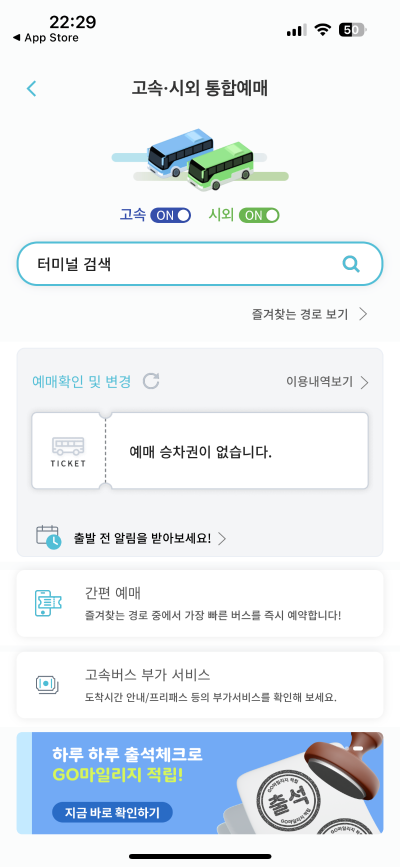 메인화면에 있는 고속, 시외 버튼을 클릭합니다.