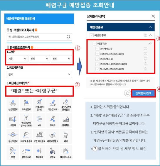 지역을 선택하고, 검색창에 "폐렴구균"을 입력하시면 각 병원의 비급여 접종비용을 확인하실 수 있습니다.