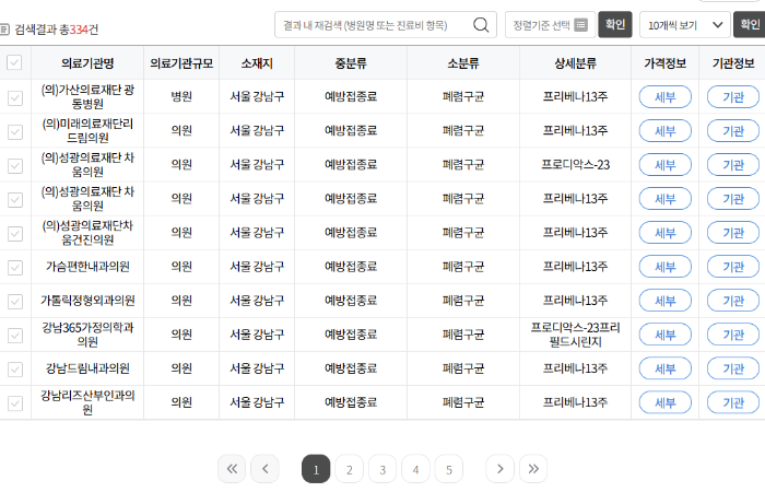 또한 오른쪽에 표시되는 "세부" 버튼을 클릭하면 해당 병원의 접종 비용은 물론, 지역 내 최저가와 최고가도 비교할 수 있어 합리적인 선택이 가능합니다.